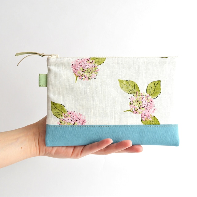 ⚠お一人様1点までのご購入とさせていただきます ⚠営利目的の購入・転売ご遠慮ください ⚠別のオンラインショップで複数お買い上げの場合、お取引をお断りすることがございます ....................... フランス製のリネン生地と無地の帆布生地を使ったポーチです。 ペンケースとして、バッグインバッグとして、小物を収納するにもよいサイズです。 文庫本、A6サイズの手帳も入れることができるサイズになります。 メイクポーチとしてもお使いいただけます。 《使用生地》 表:Import "Hydrangea" from France. ハンドペイントのような紫陽花がプリントされた上品なリネン生地。 裏:ミントグリーンに白のドット柄アメリカンコットン生地。 帆布:ターコイズブルー 帆布(タブ):ライトグリーン ファスナー部分:ターコイズグリーンの牛革をアクセントに使用しています。 【商品詳細】 サイズ:[外寸] おおよそ 幅 20.3cm x 高さ 14cm ファスナー開封部分のサイズ 17.5cm 素材:リネン コットン ファスナー(YKK) 牛革