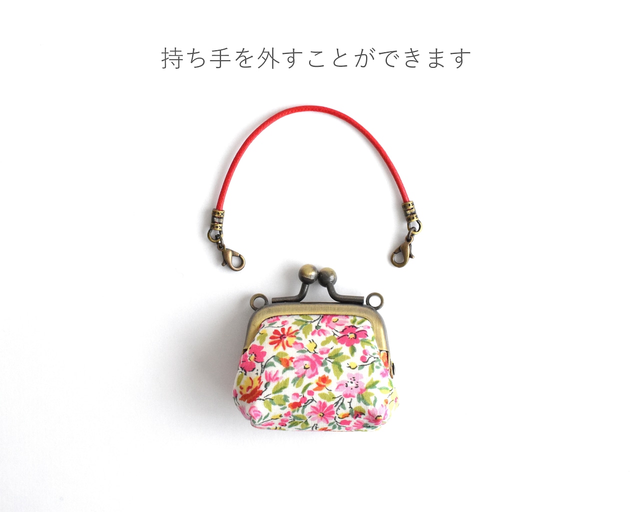 リバティの生地を使ったちいさなハンドバッグのようながまぐちアクセサリーです。